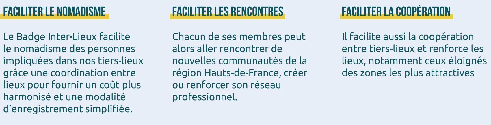 - Le Badge Inter-Lieux est un projet facilitant l'accès aux tiers-lieux et espaces de coworkings ayant une gestion collective. Il est proposé aux personnes qui comprennent l'enjeu de contribuer à la vie de ces lieux.